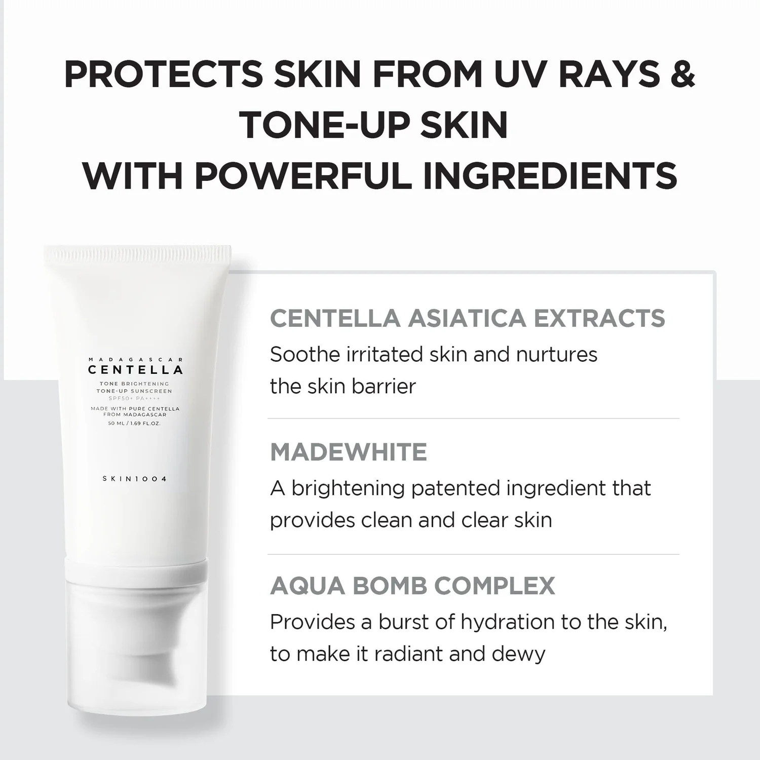 ضد آفتاب ضدلک و روشن کننده تون آپ سنتلا، این محصول یک ضد آفتاب هیبریدی شیمیایی و فیزیکی روشن کننده و تون آپ از برند اسکین ۱۰۰۴ است که محافظت کامل از پوست در برابر اشعه های UVA و UVB با فاکتورهای محافظتی SPF50 و PA++++ را دارد. این محصول خاصیت روشن کنندگی ، کمک به رفع لک ها و پیگمنت های اضافی پوست و جلوگیری از ایجاد آنها را دارد.تسکین دهنده ، التیام بخش پوست های حساس ، کاهش التهابات پوست و جلوگیری از بروز انواع حساسیت و قرمزی میشود. آبرسان و مرطوب کننده پوست ، حفظ رطوبت پوست به مدت طولانی ، رفع علائم ناشی از کم آبی پوست و جلوگیری از دهیدراته شدن آن در اثر گرما ، اشعه و نور خورشید میشود.